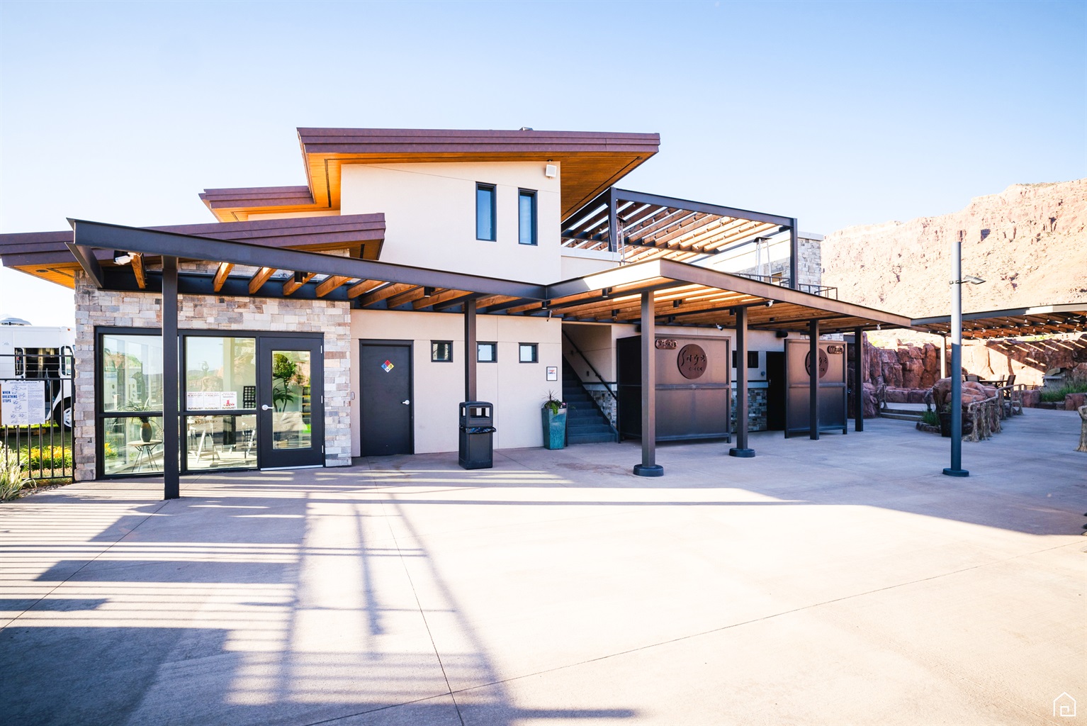 The Moab themed outdoor area includes a pool, hot tub, water falls, weeping water falls, zero entry pool, lazy river and a bocce ball court, fire pits, fire warming kiosks, and a large 150" movie screen and theater sound system for late night movies. The seasonal pool is heated.
