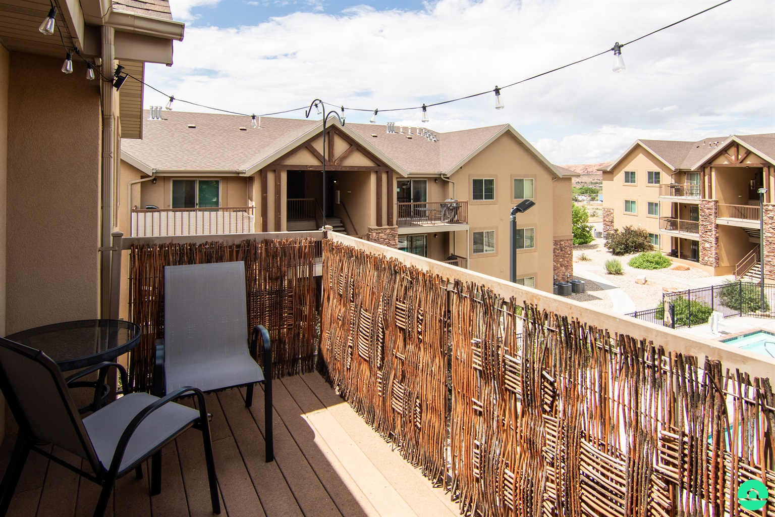 --Balcony is equipped with patio furniture and a Weber propane grill.